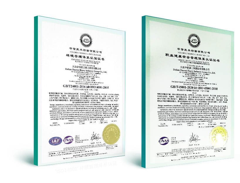 大連重工在確保公司產(chǎn)品、活動(dòng)和服務(wù)符合國際職業(yè)健康安全和環(huán)境的政策、法律、法規(guī)及其他的要求,公司順利通過了'ISO45001職業(yè)健康安全管理體系認(rèn)證和 'ISO14001' 環(huán)境管理體系認(rèn)證,持續(xù)保持并改進(jìn)。