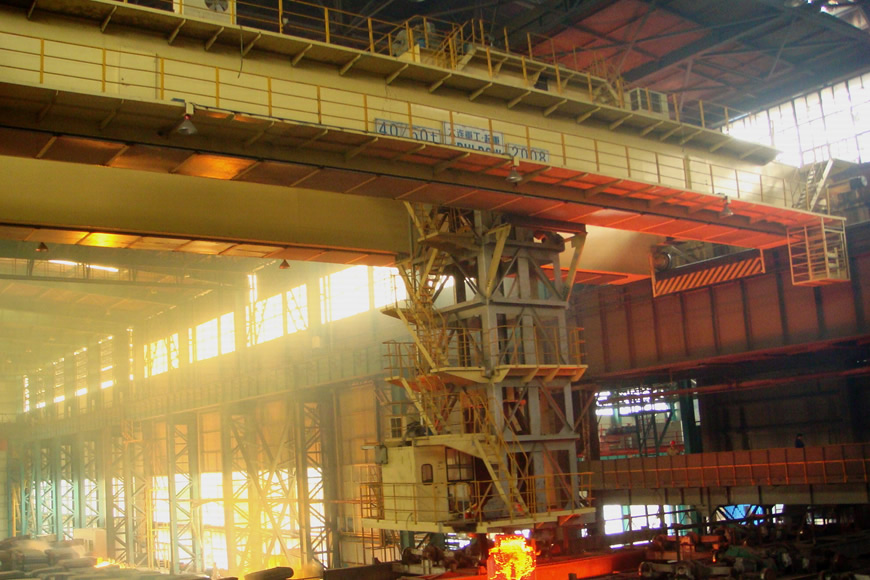 鑄造起重機(jī)是煉鋼連鑄工藝中的主要設(shè)備之一,主要用于轉(zhuǎn)爐加料跨向轉(zhuǎn)爐兌鐵水,在精煉跨將鋼水吊運(yùn)至精練爐或在鋼水接受跨將鋼水吊運(yùn)到連鑄回轉(zhuǎn)大包臺(tái)上。大連重工設(shè)計(jì)制造的75-480噸鑄造起重機(jī)服務(wù)于國(guó)內(nèi)各大鋼廠,并出口至印度、巴西、墨西哥、泰國(guó)、馬來(lái)西亞等國(guó)家。